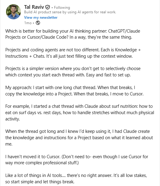 It’s an interesting take, and while I agree, it’s just that, I still prefer ChatGPT Projects for long, iterative conversations because it fits my workflow and budget better. Mostly, this is UX preference. The principle stays the same: your artifacts need a stable home.